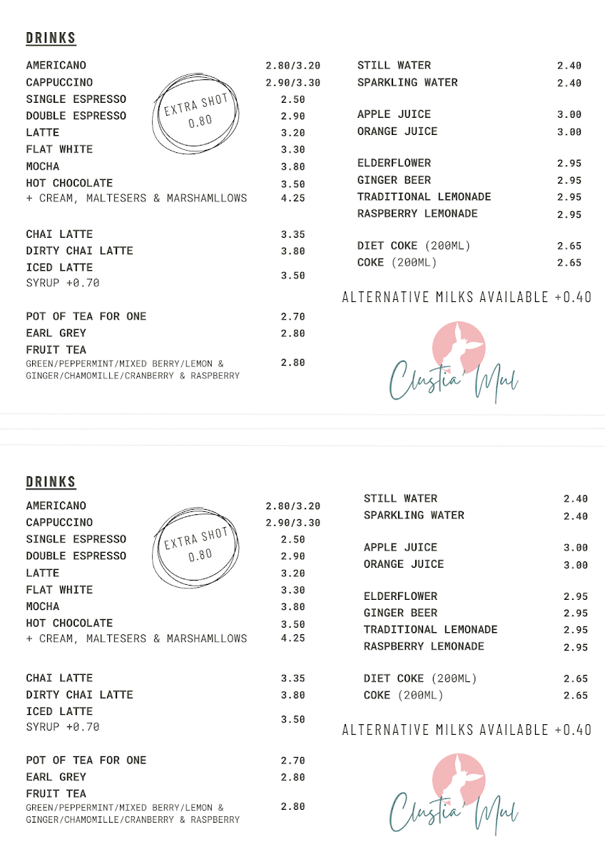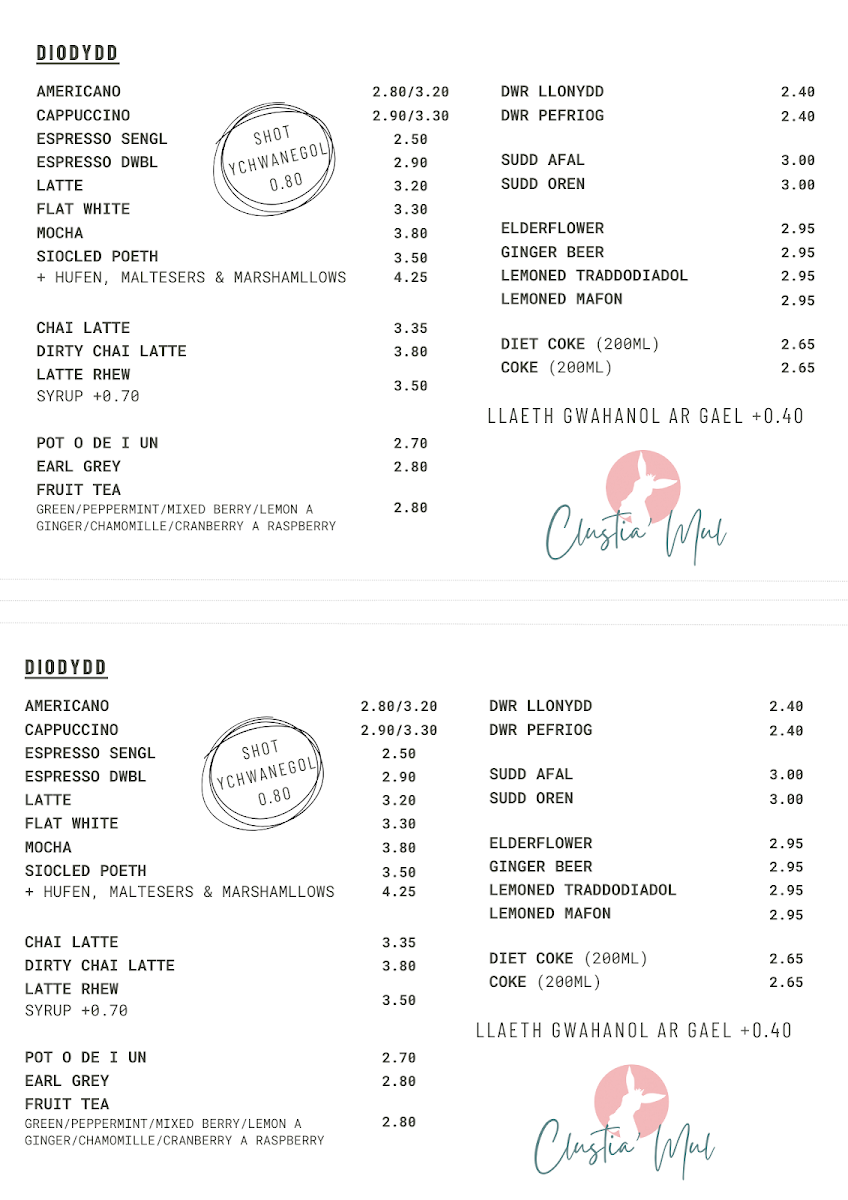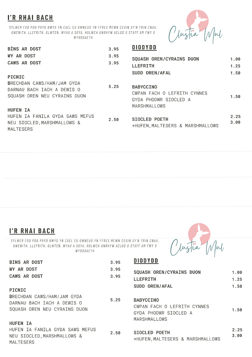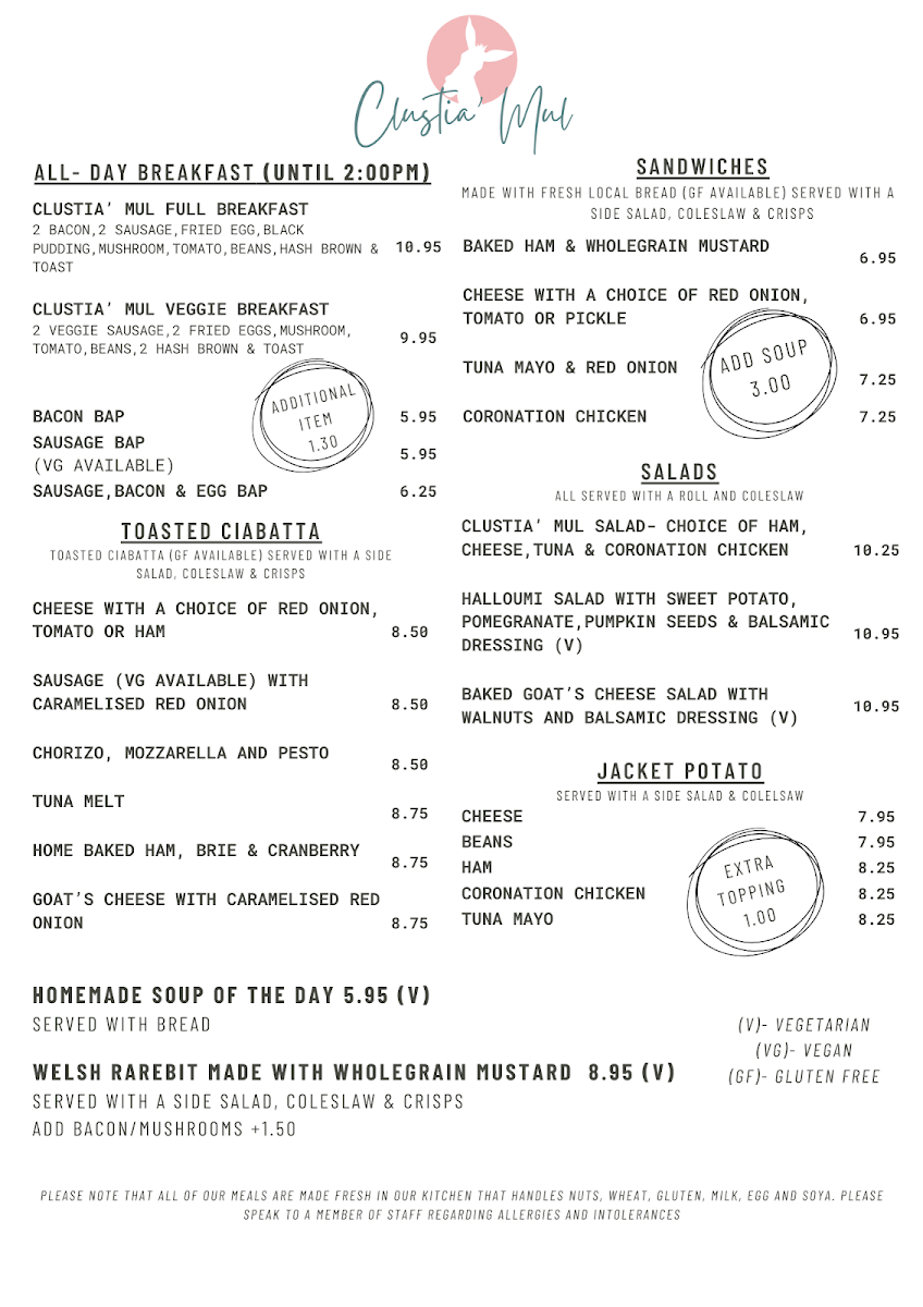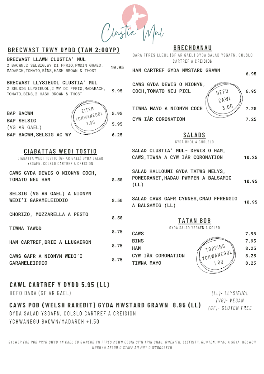 The menu at Clustia' Mul is designed to cater primarily to breakfast and light meal occasions, offering a variety of traditional and café-style options. Patrons can expect a selection of well-known breakfast plates including a Welsh Rarebit and an English Breakfast Plate, accompanied by simpler choices such as bread with tuna and cheese.
